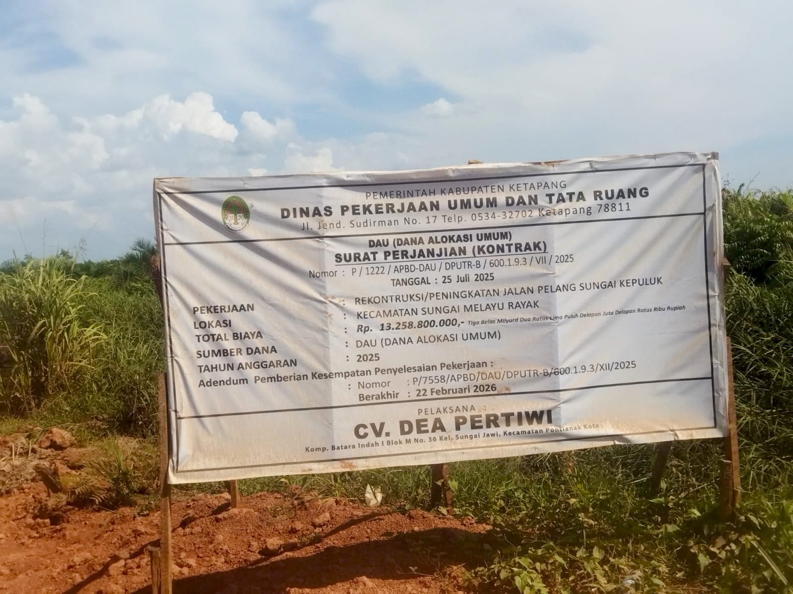 Indo-Sight.com | Ketapang, Kalimantan Barat – Proyek peningkatan Jalan Pelang–Kepuluk di Kabupaten Ketapang dengan pagu anggaran Rp13.258.800.000 yang bersumber dari Dana Alokasi Umum (DAU) melalui Dinas Pekerjaan Umum dan Tata Ruang Kabupaten Ketapang terancam mangkrak. Hingga akhir Februari 2026, pekerjaan yang dianggarkan Tahun 2025 itu belum juga rampung dan tercatat telah mengalami dua kali perpanjangan kontrak (addendum).